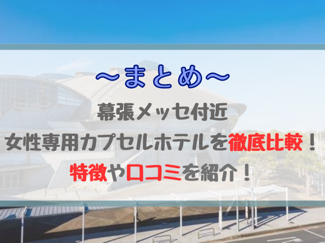そこで今回は、幕張メッセ付近の女性専用カプセルホテルを徹底比較して、海浜幕張駅からのアクセス・館内の清潔感・最終チェックイン時間をわかりやすくまとめました。